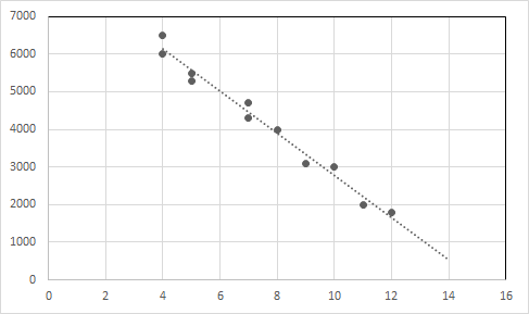 यो सम्बन्धको लागि रैखिक प्रतिगमन समीकरण Y = -557.62125 X + 8356.81293 हो।