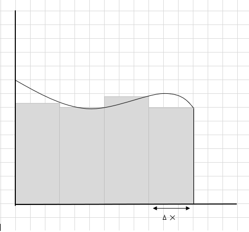 Ang kabuuan ng lugar ng mga rectangular na segment na ito ay ang tinantyang lugar sa ilalim ng curve na ito. \(\Delta x \) ang lapad ng mga parihaba/hiwa. Ano sa palagay mo ang tinatayang lugar?